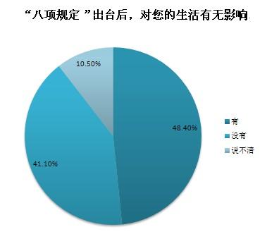截至2013年12月20日10時,共收到網絡問卷2442份,48.4%的受訪者認為“八項規(guī)定”對個人生活有影響,其中公務員群體認為“八項規(guī)定”帶來的最大影響是“公務吃請少了,能抽出更多時間陪伴家人”和“津貼補貼獎金少了,勒緊褲帶過日子”,非公務員群體認為“八項規(guī)定”帶來的最大影響是“酒店、高端會所門外的公務用車少了”和“遇到領導考察工作時,地毯鮮花迎送領導的情況少了”。