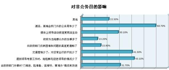 還有三到五成受訪公務員認為“辦公經費控制更嚴格,需要更加節(jié)約地使用辦公用品”、“群眾滿意度在業(yè)績考核中比重增加,工作態(tài)度更認真了”和“陪同領導考察工作的情況少了,能抽出更多時間處理其他工作”是“八項規(guī)定”帶來的幾大影響。