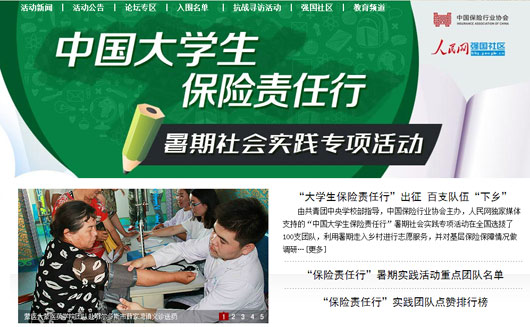 本次活動(dòng)從全國27個(gè)省市100多所高校選拔出100支入圍團(tuán)隊(duì),在暑期分別以支教、環(huán)保、醫(yī)療、調(diào)研等形式服務(wù)鄉(xiāng)村,提高當(dāng)?shù)鼐用癜踩庾R(shí),提升社會(huì)對(duì)安全教育問題的關(guān)注,同時(shí)開展調(diào)研,了解基層保險(xiǎn)保障相關(guān)情況。各團(tuán)隊(duì)實(shí)踐期間在人民網(wǎng)強(qiáng)國社區(qū)活動(dòng)專區(qū)實(shí)時(shí)播報(bào)實(shí)踐進(jìn)程,發(fā)回稿件數(shù)千篇。大學(xué)生們積極走入社會(huì)、服務(wù)基層的實(shí)際行動(dòng)贏得50萬網(wǎng)友為他們“點(diǎn)贊”。