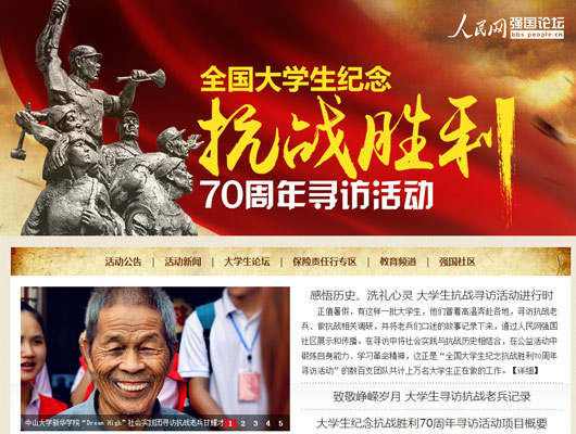 本次活動(dòng)吸引了來自全國200多所高校的800支大學(xué)生團(tuán)隊(duì)報(bào)名,大學(xué)生們尋訪抗戰(zhàn)老兵,聆聽抗戰(zhàn)故事,重走抗戰(zhàn)遺址,調(diào)研人文歷史,感悟革命精神。各團(tuán)隊(duì)實(shí)踐期間在人民網(wǎng)強(qiáng)國社區(qū)大學(xué)生論壇實(shí)時(shí)播報(bào)實(shí)踐進(jìn)程,發(fā)回稿件數(shù)千篇。浙江大學(xué)一位學(xué)生在實(shí)踐總結(jié)中說:“我們的活動(dòng)通過人民網(wǎng)的平臺(tái)得到了更多媒體的關(guān)注,讓更多的人關(guān)注到關(guān)愛抗戰(zhàn)老兵行動(dòng),這個(gè)暑假?zèng)]有白過,真的很有意義!”
