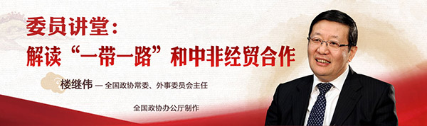 全國政協(xié)辦公廳制作的“委員講堂”第二期節(jié)目,3月2日在全國政協(xié)官方網(wǎng)站等平臺播出。本期節(jié)目由全國政協(xié)常委、外事委員會主任樓繼偉主講,主題是《共建與共享——關(guān)于“一帶一路”和中非經(jīng)貿(mào)合作的思考》。