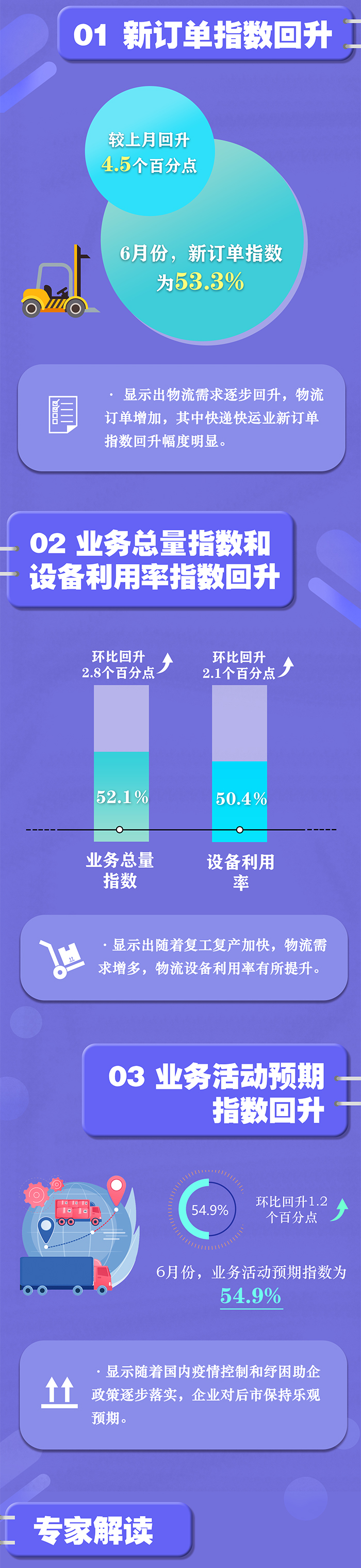物流被稱作是國民經(jīng)濟的“晴雨表”。中國物流與采購聯(lián)合會會長助理、高級經(jīng)濟師何輝在接受人民網(wǎng)“強觀察”欄目記者采訪時表示,從物流業(yè)景氣指數(shù)等數(shù)據(jù)看,隨著國內(nèi)疫情防控形勢好轉(zhuǎn)和穩(wěn)經(jīng)濟系列政策持續(xù)發(fā)力,6月份國內(nèi)市場供應鏈上下游業(yè)務活動進一步恢復,并逐步趨于活躍。