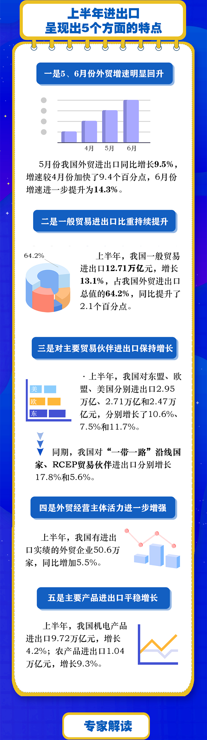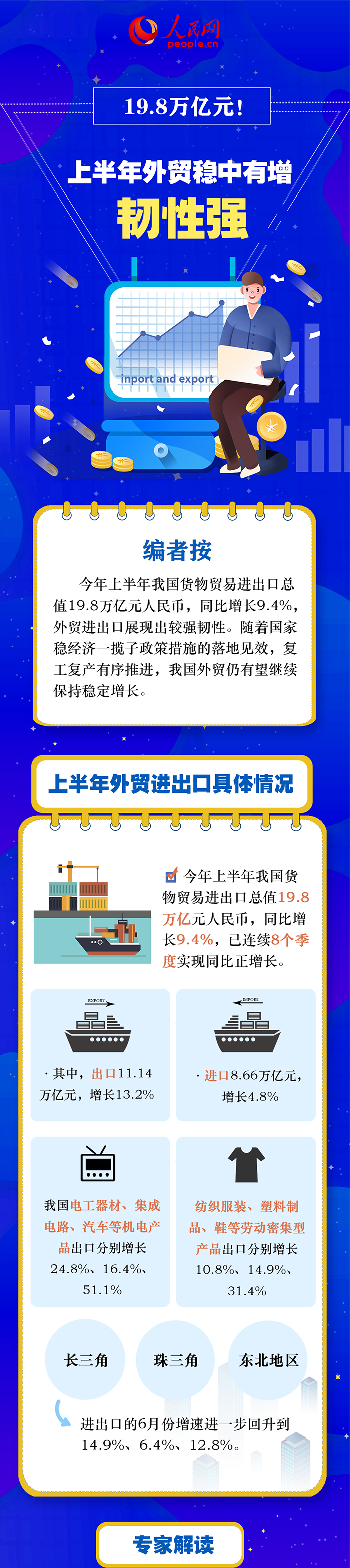 上半年我國外貿(mào)進出口展現(xiàn)出較強的韌性,一季度平穩(wěn)開局,5、6月份迅速扭轉(zhuǎn)了4月份增速下滑的趨勢,為全年外貿(mào)保穩(wěn)提質(zhì)打下了堅實的基礎。據(jù)海關統(tǒng)計,今年上半年我國貨物貿(mào)易進出口總值19.8萬億元人民幣,同比增長9.4%。其中,出口11.14萬億元,增長13.2%;進口8.66萬億元,增長4.8%。