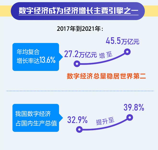 《報(bào)告》顯示,2017年到2021年,我國(guó)數(shù)字經(jīng)濟(jì)規(guī)模從27.2萬(wàn)億增至45.5萬(wàn)億元,總量穩(wěn)居世界第二,年均復(fù)合增長(zhǎng)率達(dá)13.6%,占國(guó)內(nèi)生產(chǎn)總值比重從32.9%提升至39.8%,成為推動(dòng)經(jīng)濟(jì)增長(zhǎng)的主要引擎之一。